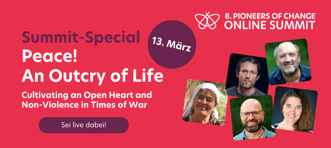 Der 8. Pioneers of Change Online-Summit findet vom 7. – 19. März statt. Mehr als 30 Mutmacher und Mutmacherinnen sind dabei – darunter auch die Tamera Gründer Sabine Lichtenfels und Dieter Duhm. Der Summit-Special ist “Peace! An Outcry of Life” am 13. März 2024, von 19:00 – 21:00 – live im englischen Original mit Synchron-Übersetzung. Es sprechen Sabine Lichtenfels, Sami Awad, Gabriel Meyer-Halevy, Charles Eisenstein & Kosha Joubert. Die Teilnahme ist kostenlos. Mehr Infos und Anmeldung hier